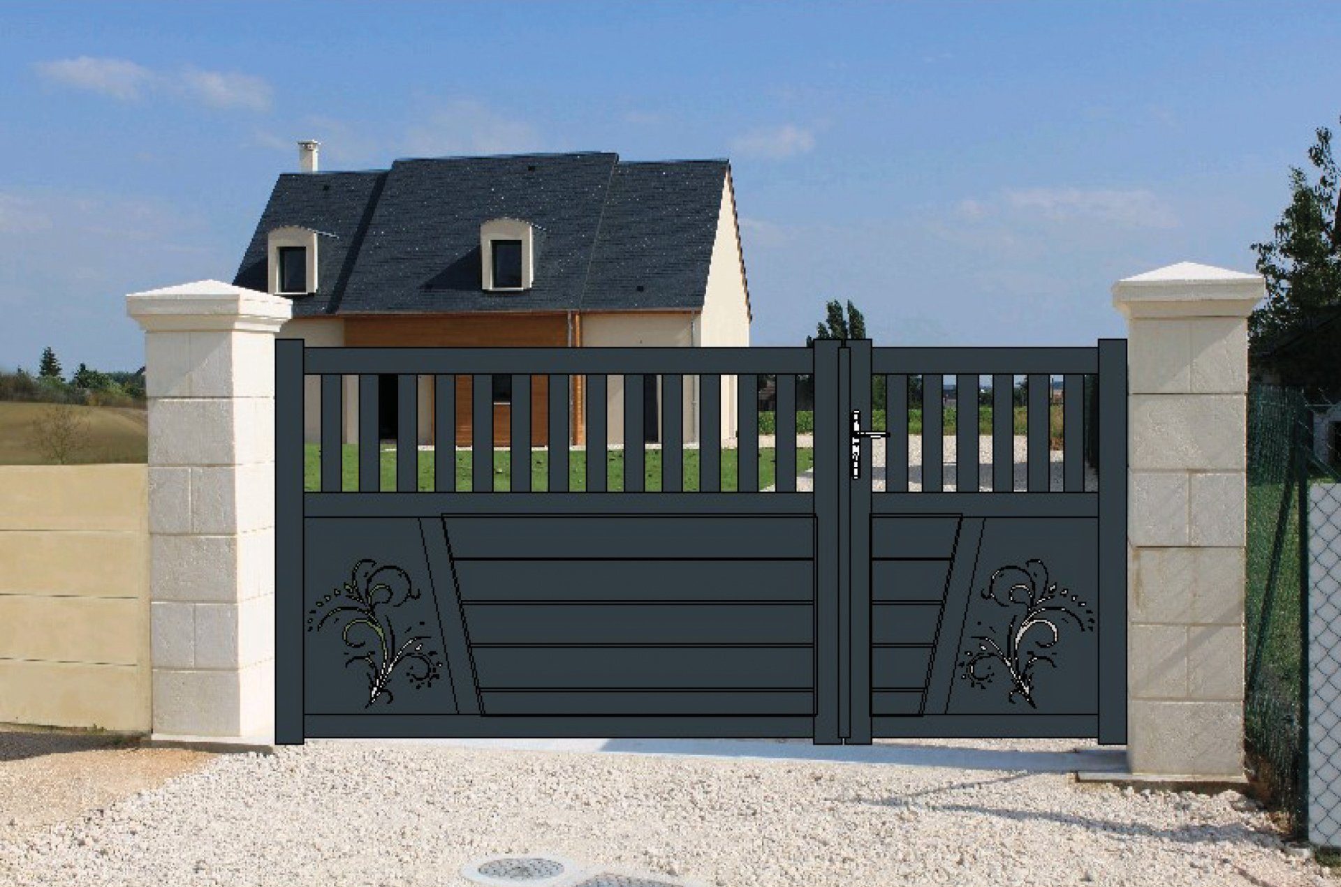Portail aluminium 2/3 1/3, barreaudage en 70 mm, parties pleines basse en lames horizontales de 150 mm, découpe laser (Arabesque).