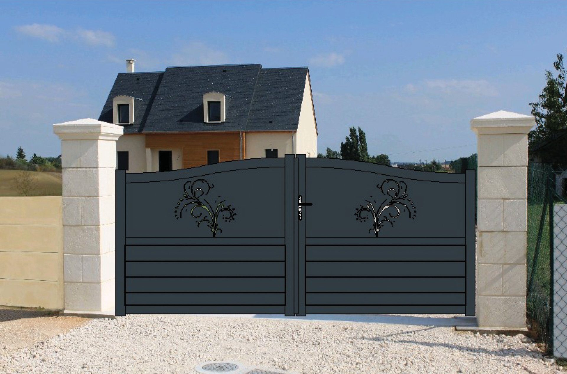 Portail aluminium double battant en chapeau de gendarme, découpe laser (Arabesque), parties pleines en lames horizontales de 150 mm.