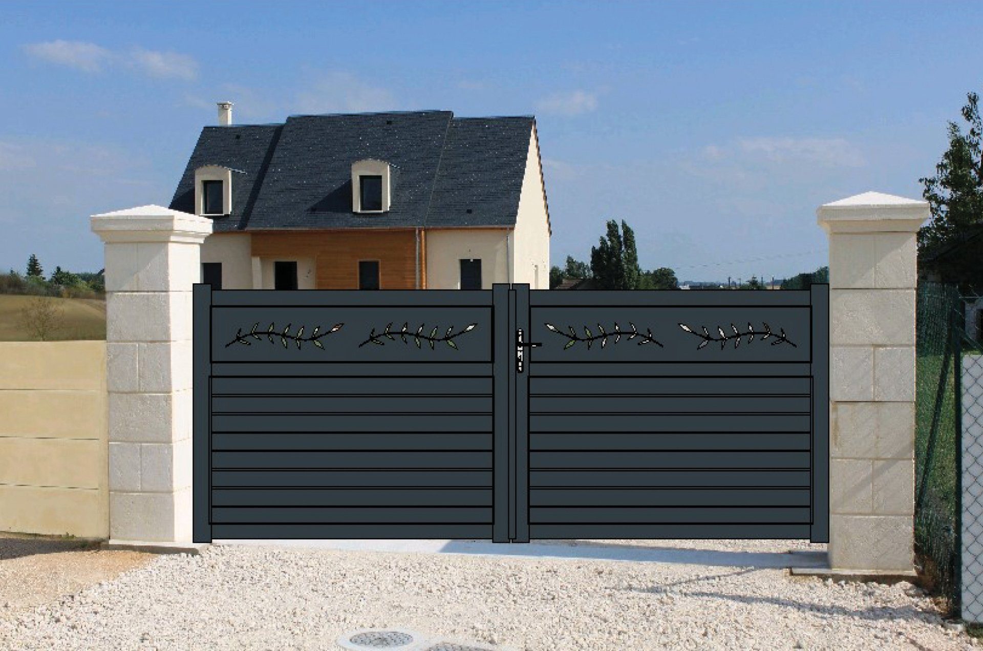 Portail aluminium double battant, découpe laser (Branche d’olivier), parties pleines en lames horizontales de 100 mm.