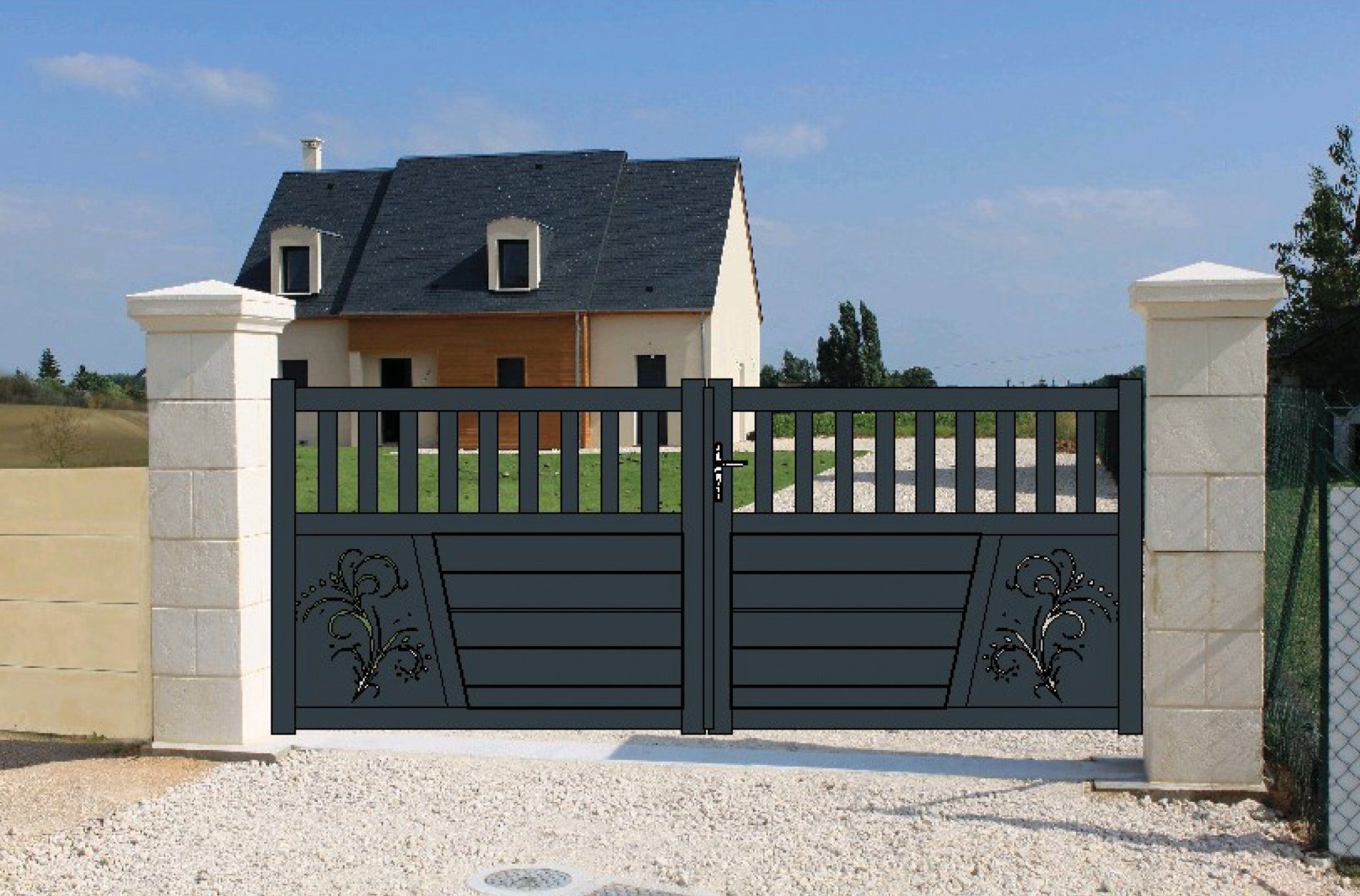 Portail aluminium double battant, barreaudage en 70 mm, parties pleines basse en lames horizontales de 150 mm, découpe laser (Arabesque).