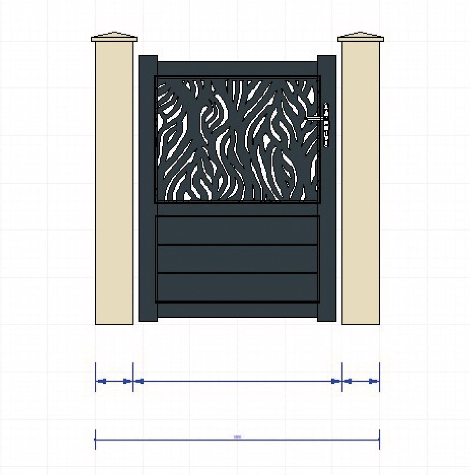 Portillon aluminium, découpe laser (Zèbre), parties pleines en lames horizontales de 150 mm sur la partie basse.