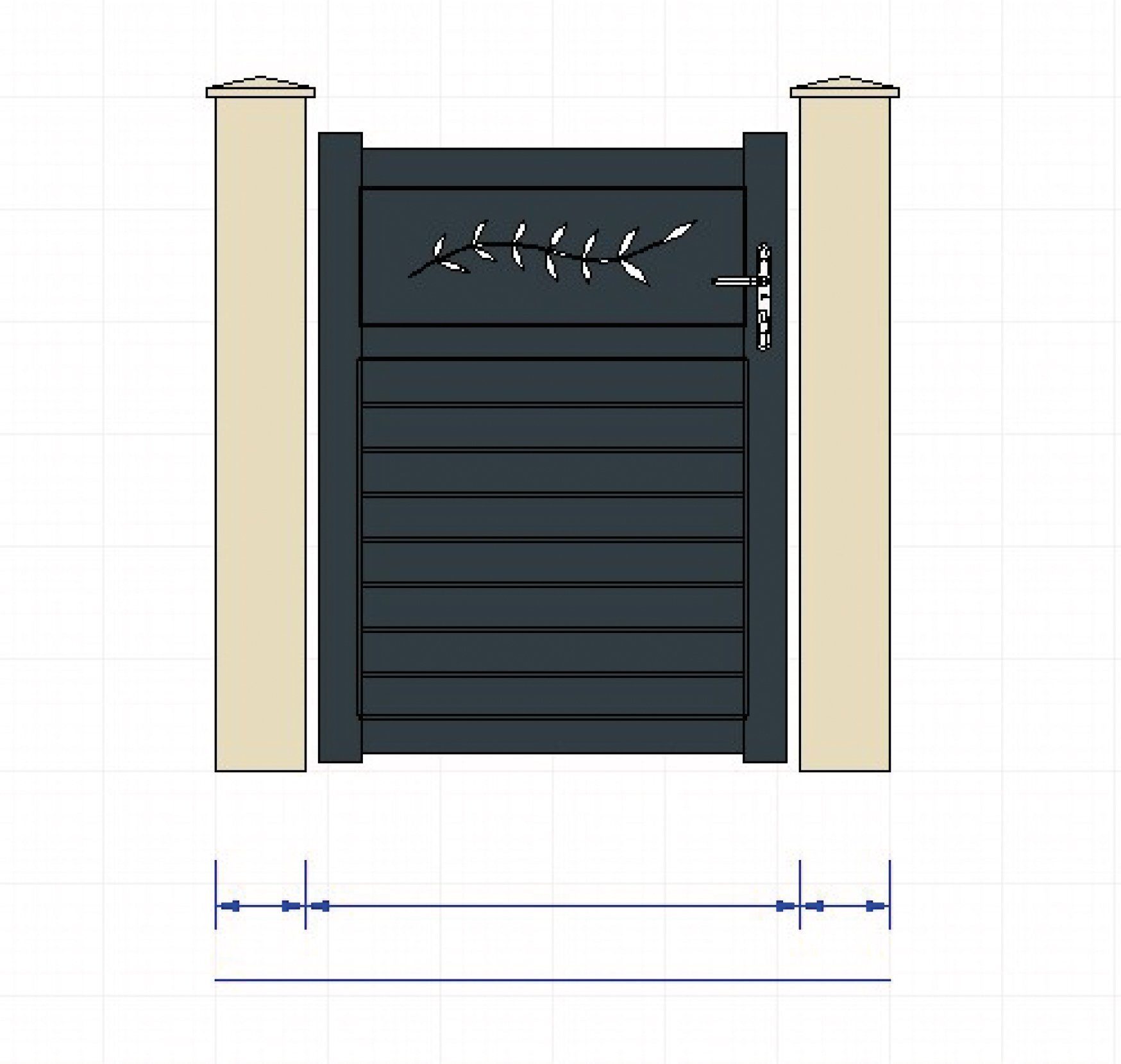 Portilon aluminium, découpe laser (Branche d’olivier) pour la partie haute du portail, parties pleines en lames horizontales de 100 mm sur la partie basse.