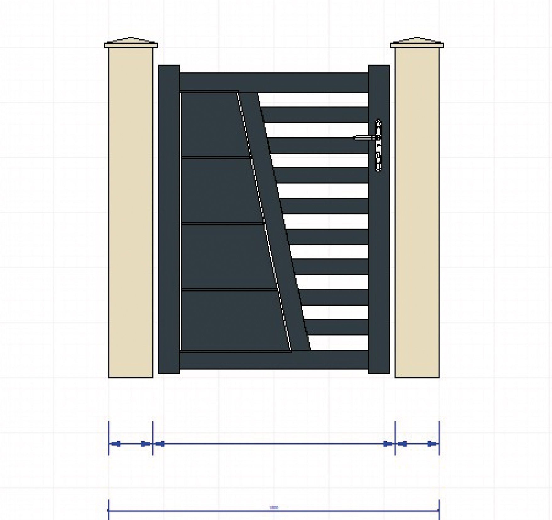 Portillon aluminium, barreaux horizontales de 70 mm pour la partie centrale du portail, parties pleines en lames horizontales de 300 mm.