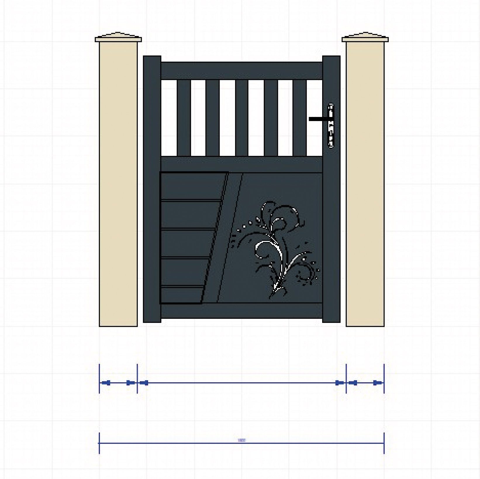 Portillon aluminium, barreaudage en 70 mm sur la partie haute, parties pleines basse en lames horizontales de 150 mm, découpe laser (Arabesque) .